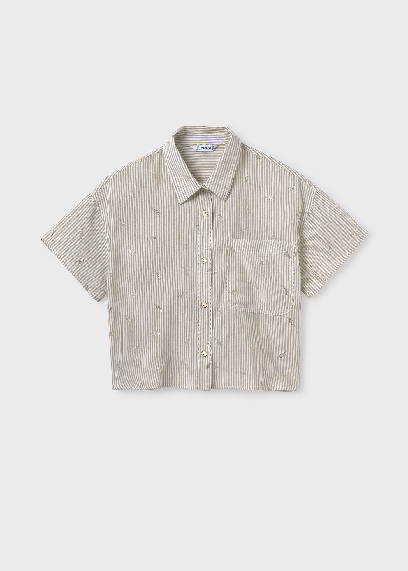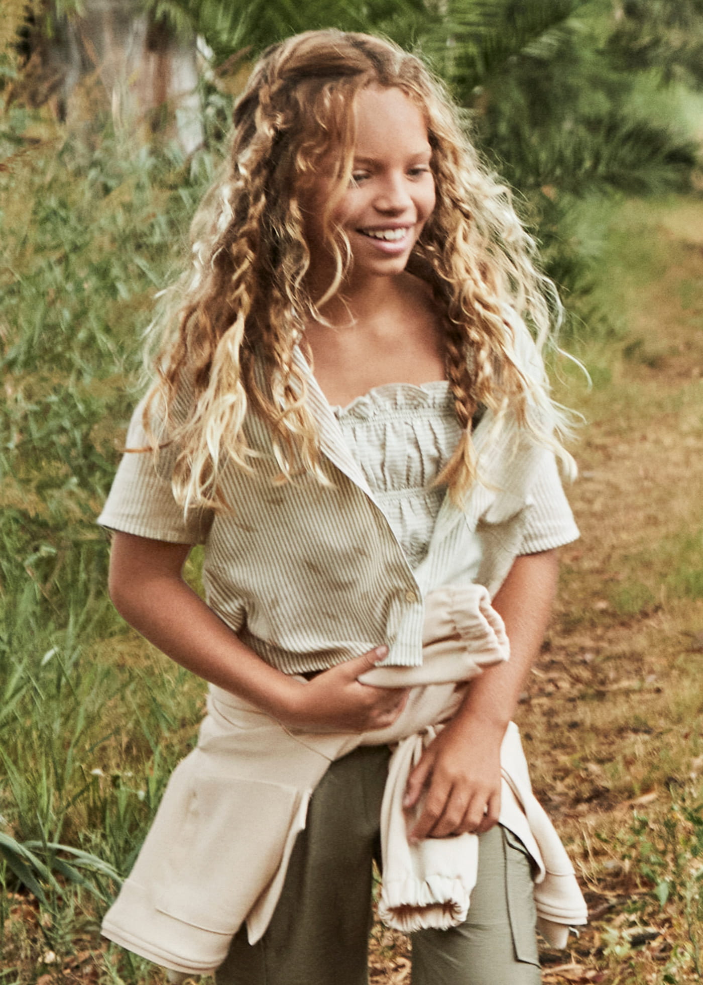Bluzka dla junior dziewczyny od Mayoral to oryginalny i stylowy wybór na cieplejsze dni. Bluzka z krótkim rękawem, zapinana na guziczki, posiada klasyczny kołnierzyk, który nadaje jej elegancki, a zarazem casualowy charakter. Model jest krótszy i lekko oversize, co sprawia, że wygląda modnie i jest wygodny. Z przodu znajduje się kieszonka, która dodaje uroku. Do bluzki dołączony jest top na ramiączkach, marszczony z gumką, co wprowadza lekkość i dziewczęcy styl. Całość wykonana z bawełny i wiskozy, co sprawia, że bluzka jest przewiewna i idealna na gorące dni. Odcień pastelowej zieleni w paski, ozdobiony subtelnymi złotymi elementami listeczków, nadaje całości eleganckiego, ale radosnego charakteru. To wyjątkowy zestaw, który doskonale sprawdzi się w letnich stylizacjach dla nastolatek.