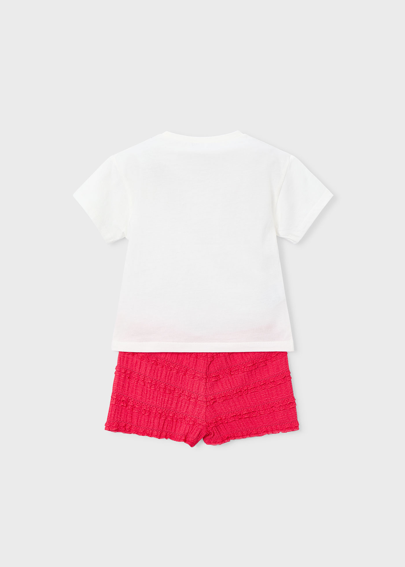 Komplet dwuczęściowy, koszulka z krótkim rękawem oraz dzianinowe szorty z koronka dla dziewczynki Mayoral