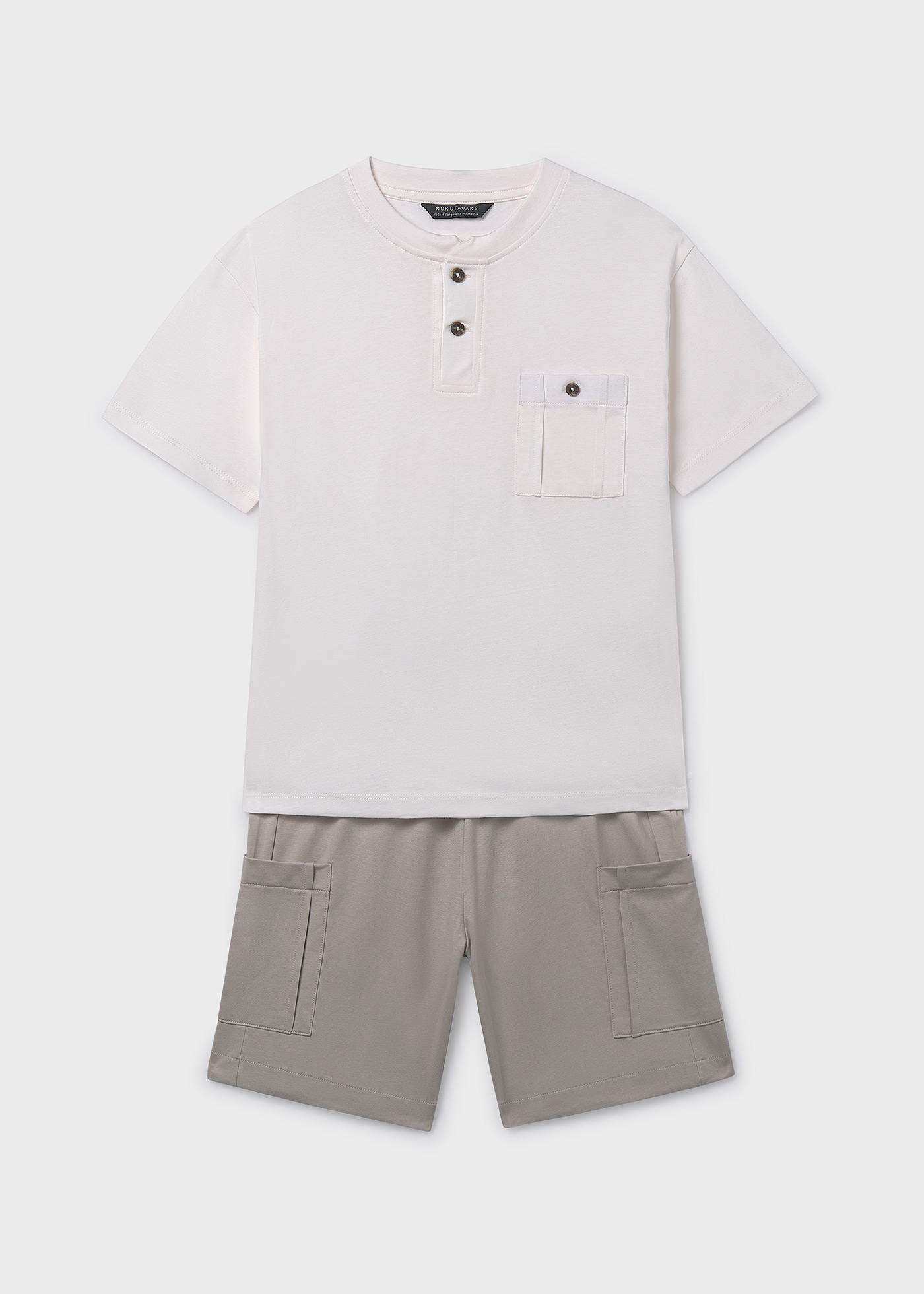 Komplet letni dla junior chłopaka marki Mayoral to idealna propozycja na ciepłe, wakacyjne dni. Zestaw składa się z koszulki z krótkim rękawem w kremowym kolorze oraz krótkich spodenek w beżowym odcieniu, łącząc komfort noszenia z praktycznym i modnym designem. Koszulka ma klasyczny krój, zapinana jest na dwa guziczki z przodu, a kieszonka również ozdobiona jest guziczkiem, co dodaje subtelnego, stylowego charakteru. Spodenki wykonane są z 100% bawełny, mają gumkę w pasie oraz dodatkowy troczek, a po bokach nogawek znajdują się praktyczne kieszenie, które zwiększają funkcjonalność i wygodę. Cały komplet jest przewiewny, lekki i nie krępuje ruchów, co sprawia, że chłopiec może czuć się w nim swobodnie podczas zabawy, spacerów czy wakacyjnych aktywności. To uniwersalny i wygodny zestaw, który łączy komfort, praktyczność i letni, modny wygląd.
