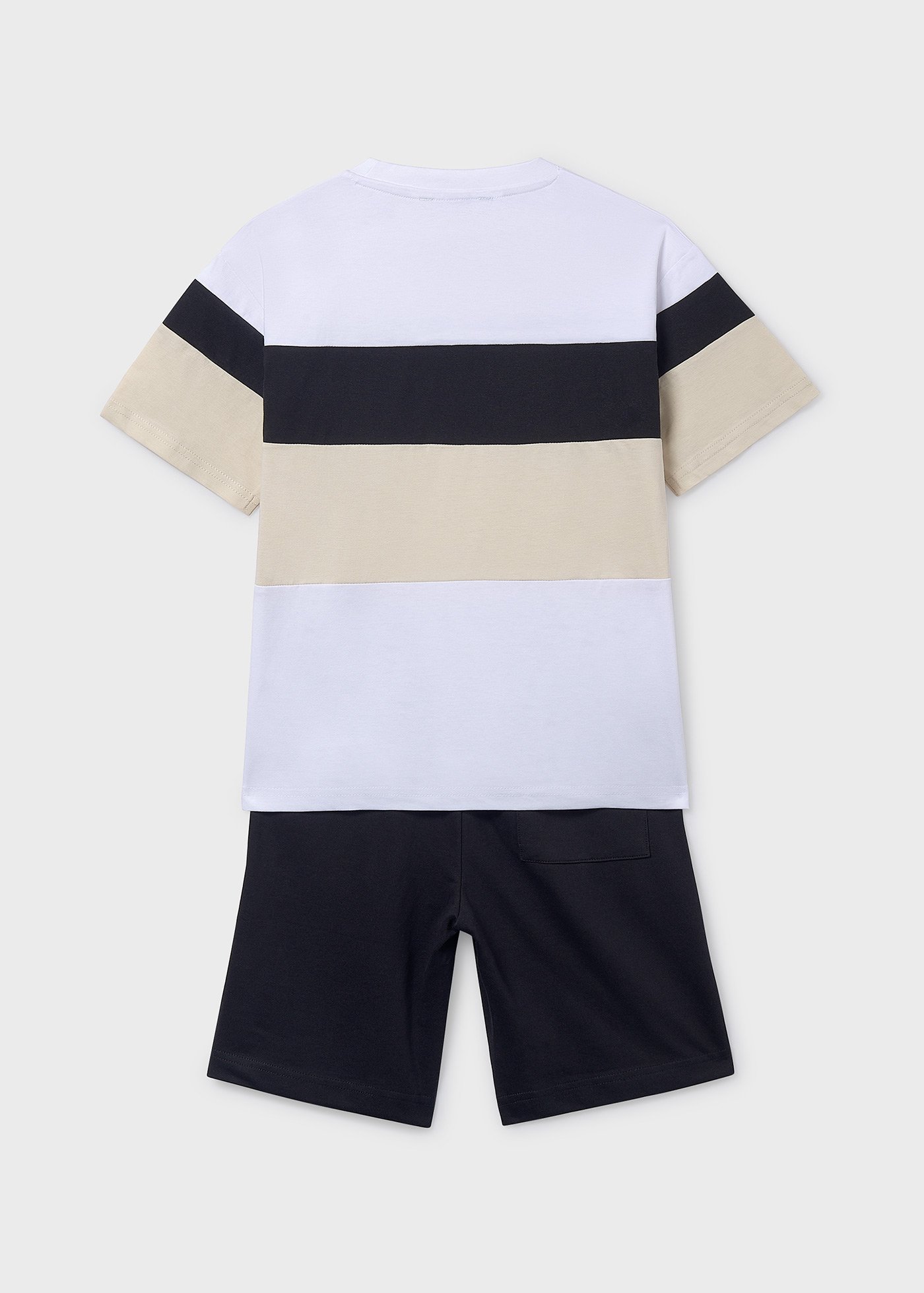 Komplet dwuczęściowy dzianinowy, koszulka z krótkim rękawem w pasy oraz szorty dla chłopca Mayoral