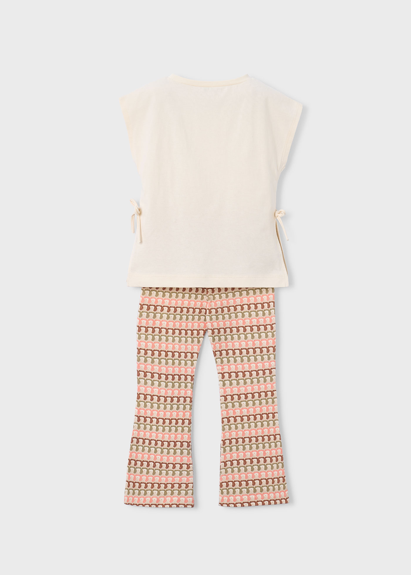 Komplet dwuczęściowy dzianinowy, koszulka z krótkim rękawem z wiązaniem i leginsy flare we wzory dla dziewczynki Mayoral ostatni rozmiar 98