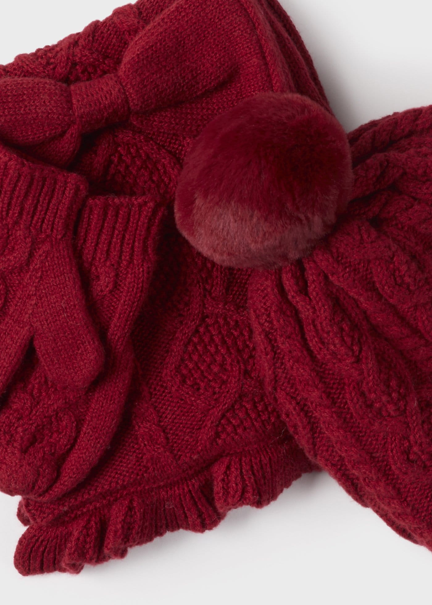 Komplet dla dziewczynki od Mayoral to uroczy i praktyczny zestaw na zimowe dni. W skład kompletu wchodzi czapka z pomponem, ciepły szalik wykończony delikatną falbanką oraz rękawiczki na jeden palec. Całość wykonana z bawełny z dodatkiem wełny, co zapewnia komfort, ciepło i miękkość, idealne na chłodniejsze dni. Model o strukturze splotu warkocza nadaje zestawowi eleganckiego charakteru, a urocze detale, takie jak falbanka i pompon, sprawiają, że komplet jest nie tylko funkcjonalny, ale i modny. To świetny wybór do zimowych stylizacji, zapewniający zarówno wygodę, jak i stylowy wygląd.