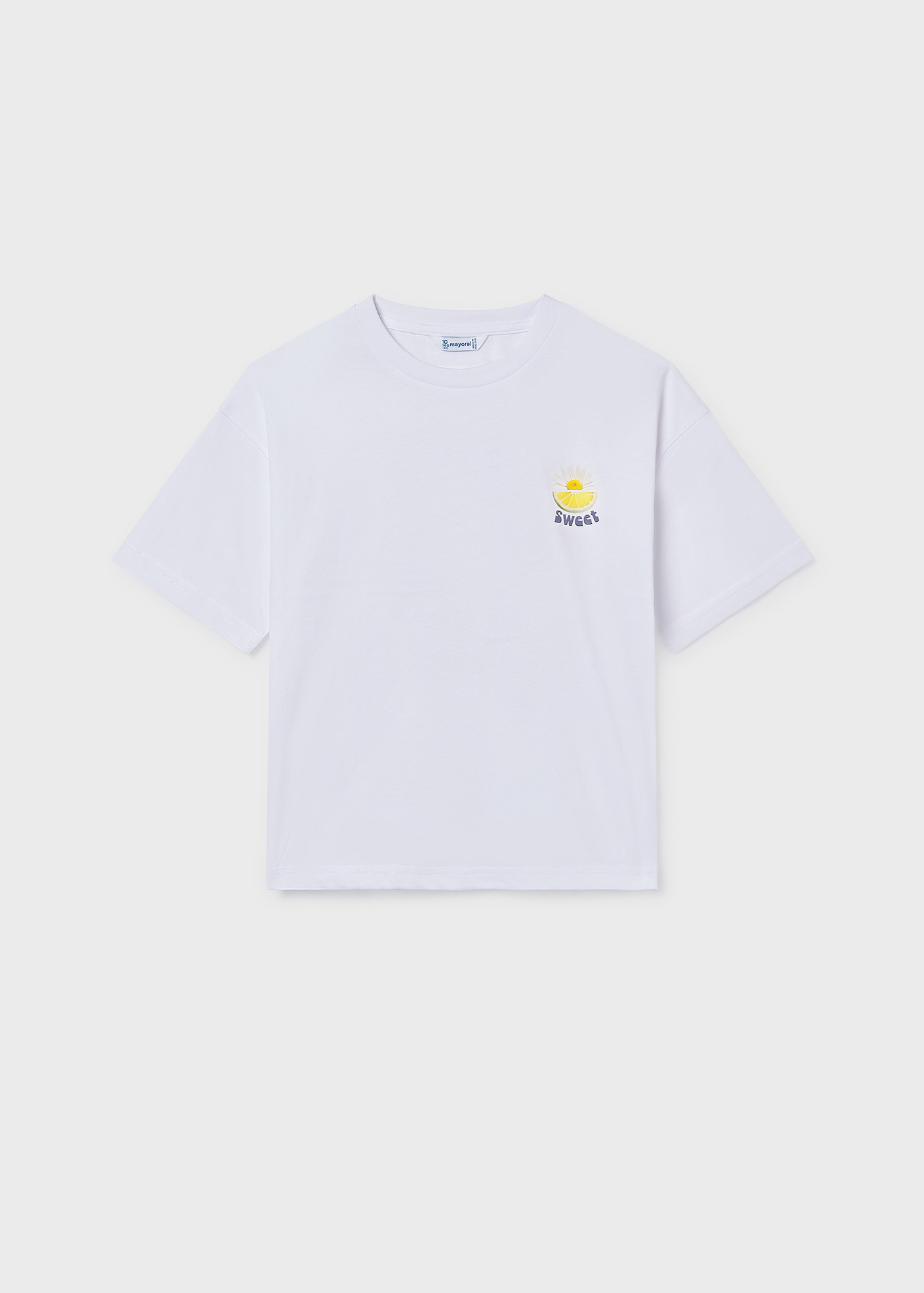 Koszulka dla dziewczynki junior Mayoral to wygodna i ponadczasowa propozycja na lato, stworzona z myślą o nastolatkach, które cenią komfort i modny wygląd. Wykonana w 100% z bawełny, jest miękka, przewiewna i przyjazna dla skóry, co sprawia, że nadaje się do noszenia przez cały dzień. Koszulka ma krótki rękaw i okrągły dekolt, który zapewnia wygodę i swobodę ruchów. Biały kolor nadaje klasycznego, świeżego charakteru, a aplikacja cytryny na przodzie i dodatkowy detal na plecach wprowadzają wakacyjny, radosny akcent. Ten model świetnie komponuje się z różnymi elementami garderoby – spodniami, szortami czy spódniczkami – pozwalając tworzyć modne i wygodne zestawy na co dzień. Koszulka Mayoral łączy wysoką jakość materiałów, komfort noszenia i uniwersalny design, idealny dla aktywnych dziewczynek w letnie dni.