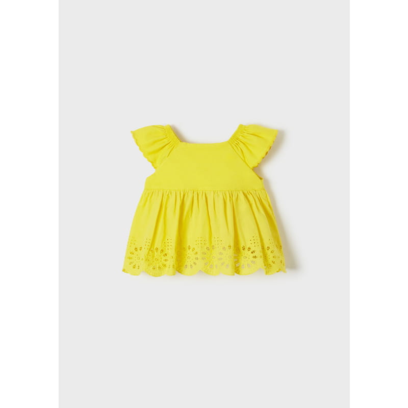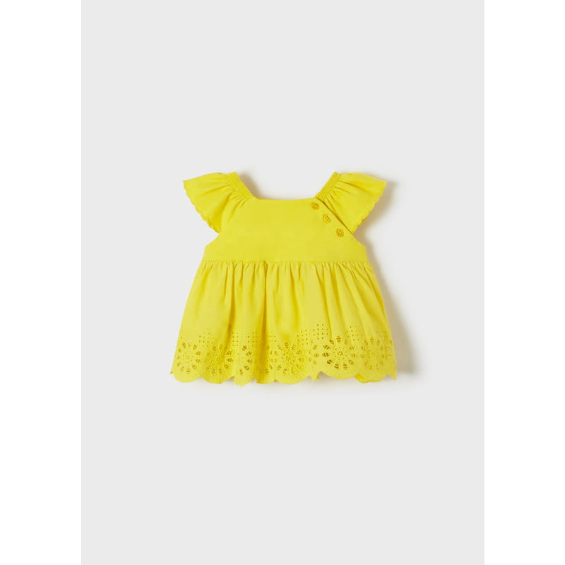 Koszulka z krótkim rękawem z detalami z falbany dla niemowlęcia dziewczynki. Zapięcie z przodu na guziki. Wygodna dzianina. Wzór wykończony falbanami.
