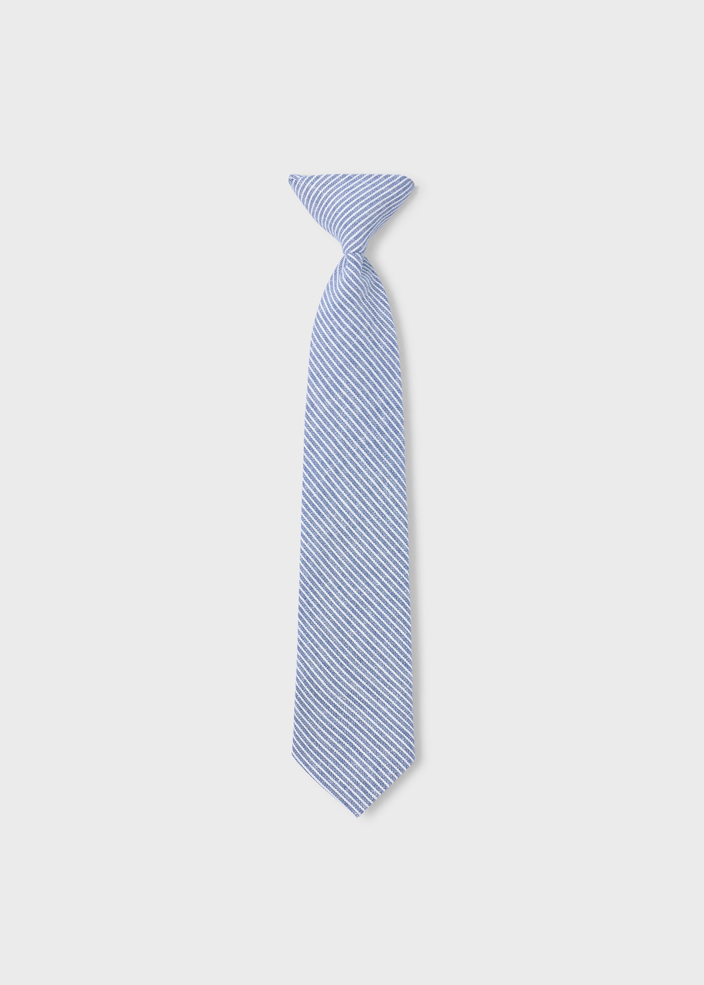 Krawat dla chłopca od Mayoral w eleganckim błękitno-białym kolorze w drobne paseczki to stylowy dodatek, który podkreśli wyjątkowy charakter każdej stylizacji. Subtelny wzór sprawia, że krawat prezentuje się klasycznie i ponadczasowo, dzięki czemu doskonale pasuje na rodzinne uroczystości, szkolne akademie czy inne ważne okazje. Wykonany w 90% z bawełny i 10% z lnu, jest lekki, przewiewny i komfortowy w noszeniu. Model na gumce z możliwością regulacji pozwala łatwo dopasować krawat do szyi dziecka, bez konieczności wiązania i bez uczucia ucisku. To idealny dodatek dla małego dżentelmena, który łączy wygodę z elegancją. Uniwersalny charakter sprawia, że świetnie komponuje się zarówno z koszulą i marynarką, jak i z bardziej swobodnym strojem.