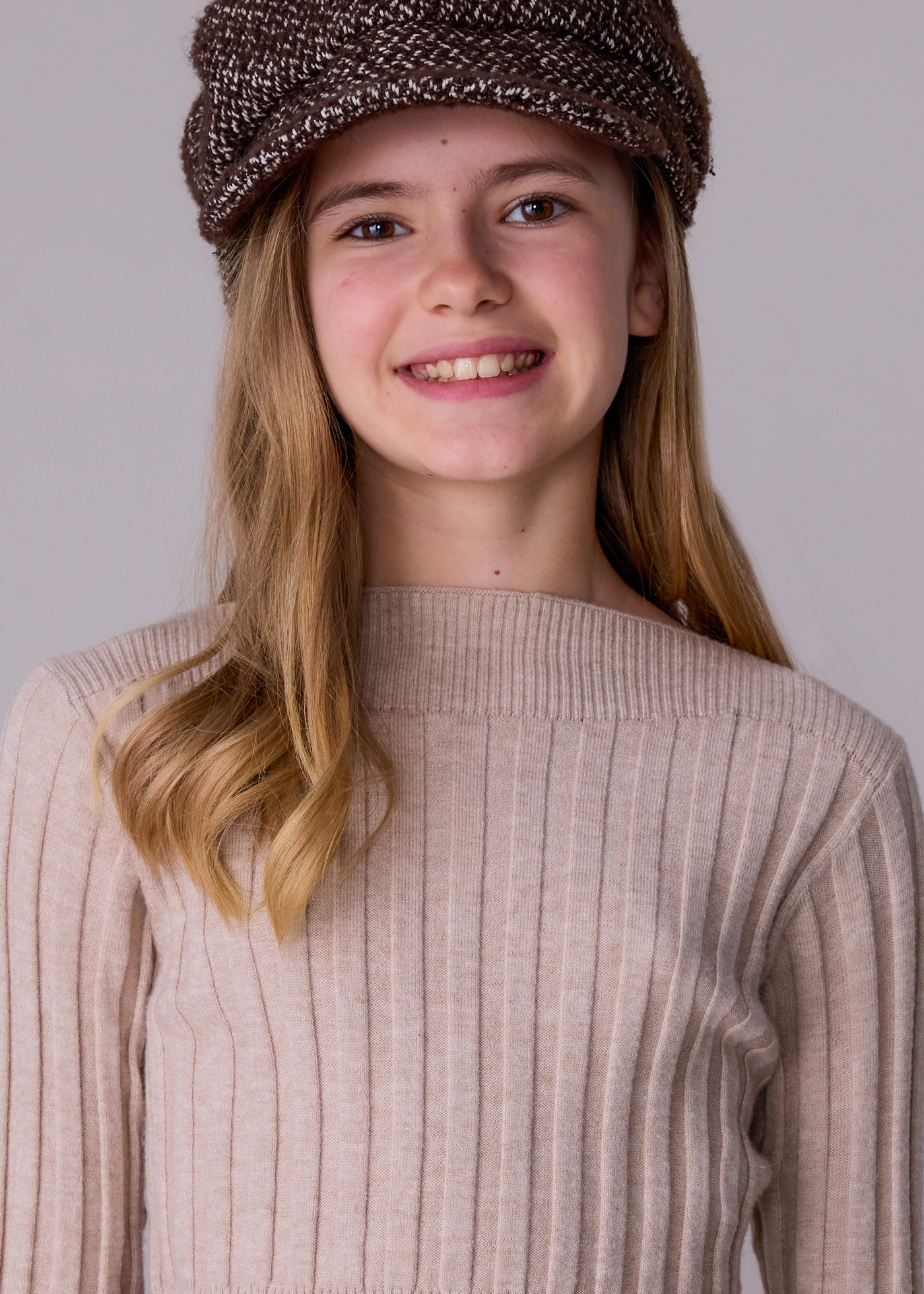 Sweter dla junior dziewczynki od Mayoral to dopasowany model z długim rękawem, wykonany z prążkowanej dzianiny w składzie 52% wiskoza, 26% poliester i 22% poliamid. Jego piękny, jesienny kolor to odcień toffi, który doda ciepła i stylu każdej stylizacji. Dekolt w łódkę podkreśla delikatność fasonu, a sweter jest niezwykle uniwersalny — idealny do spódnic, spodni, a także jako baza pod marynarkę. To doskonały wybór na chłodniejsze dni, łączący wygodę z modnym, ponadczasowym designem.