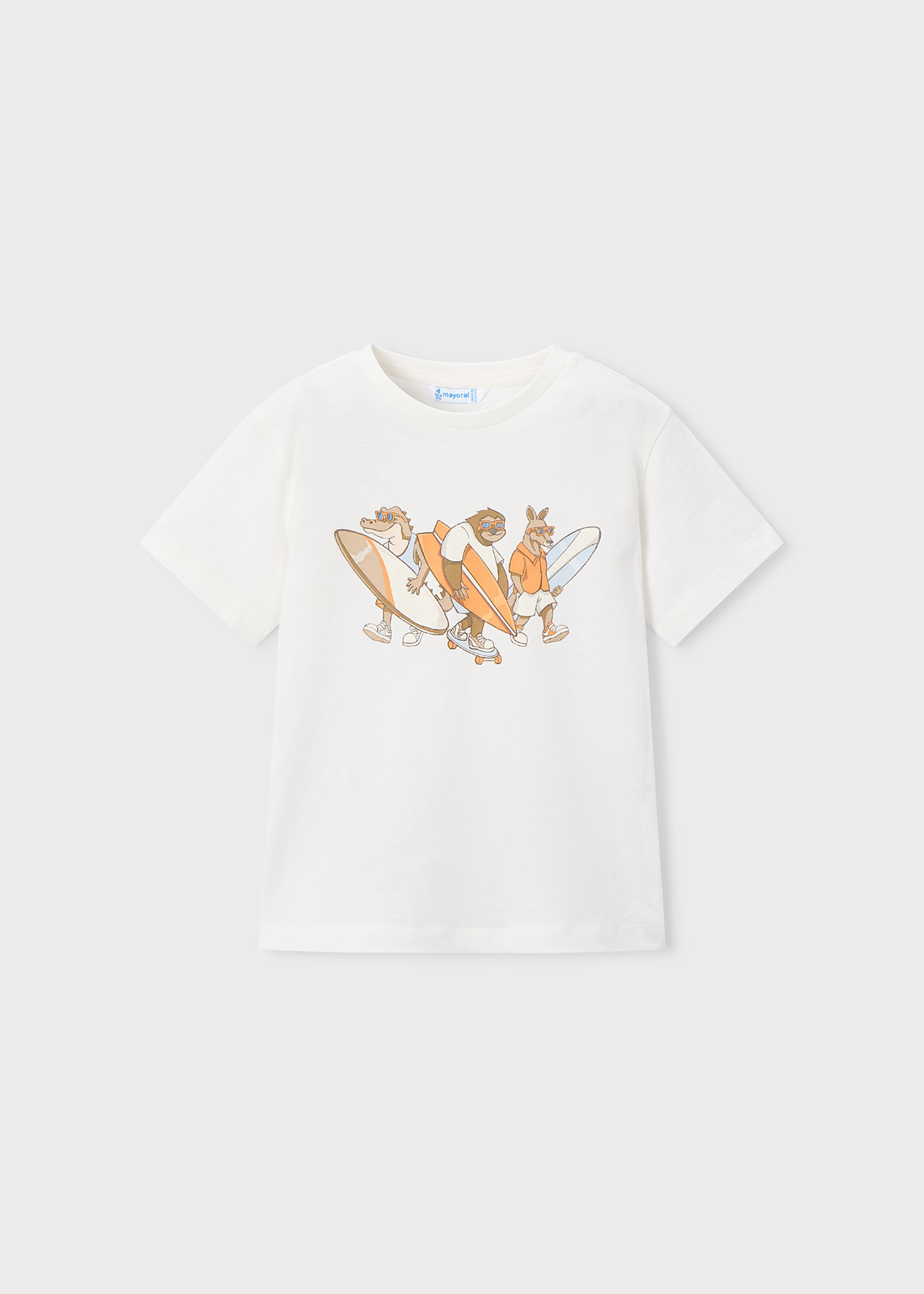 Zestaw koszulek dla chłopca marki Mayoral to idealna propozycja na wiosnę i lato. W skład zestawu wchodzą dwie koszulki z krótkim rękawem i okrągłym dekoltem, wykonane w 100% z bawełny, co zapewnia miękkość, przewiewność i komfort noszenia przez cały dzień. Pierwsza koszulka w kolorze miodowym posiada na przodzie mały nadruk palmy i napisu „Good Vibes”, a na plecach dodatkowy wakacyjny motyw palmy i kokosu, który nadaje jej radosnego, letniego charakteru. Druga koszulka w kolorze śmietankowym została ozdobiona aplikacją zwierzątek z deskami do windsurfingu, co również podkreśla wakacyjny klimat. Zestaw koszulek jest wygodny, praktyczny i świetnie sprawdzi się podczas codziennych zabaw, spacerów oraz wakacyjnych wyjść.